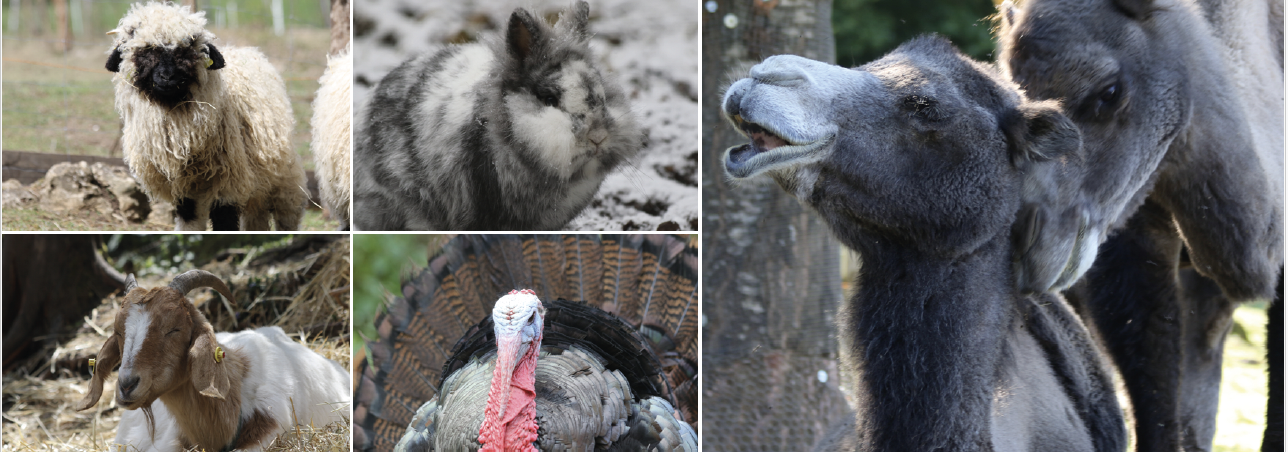 Geführte Tiererlebnisse mit Kamele, Alpakas, Esel, Ziegen, Schweine, Schafe, Kühe, Hühner und Puten.